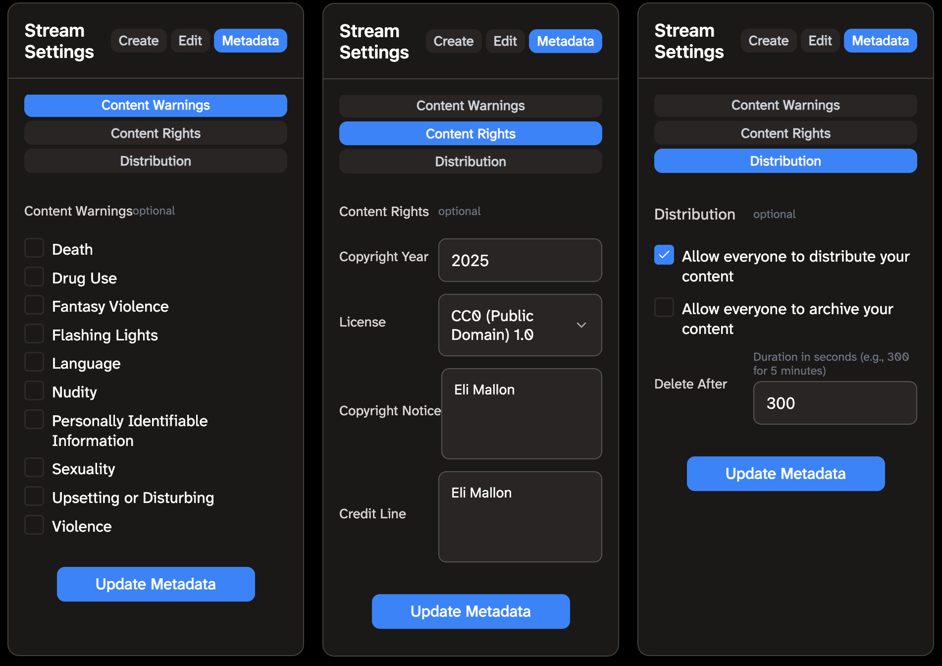 The place.stream.metadata.settings record containing all of that data then gets embedded within your livestream, allowing syndicating nodes to respect your consent automatically.